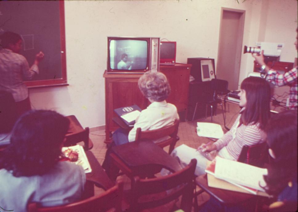 Aula sendo filmada numa espécie de video-teipe. Conforme o que está escrito no quadro em outra foto do mesmo conjunto, parece uma aula de língua inglesa.
