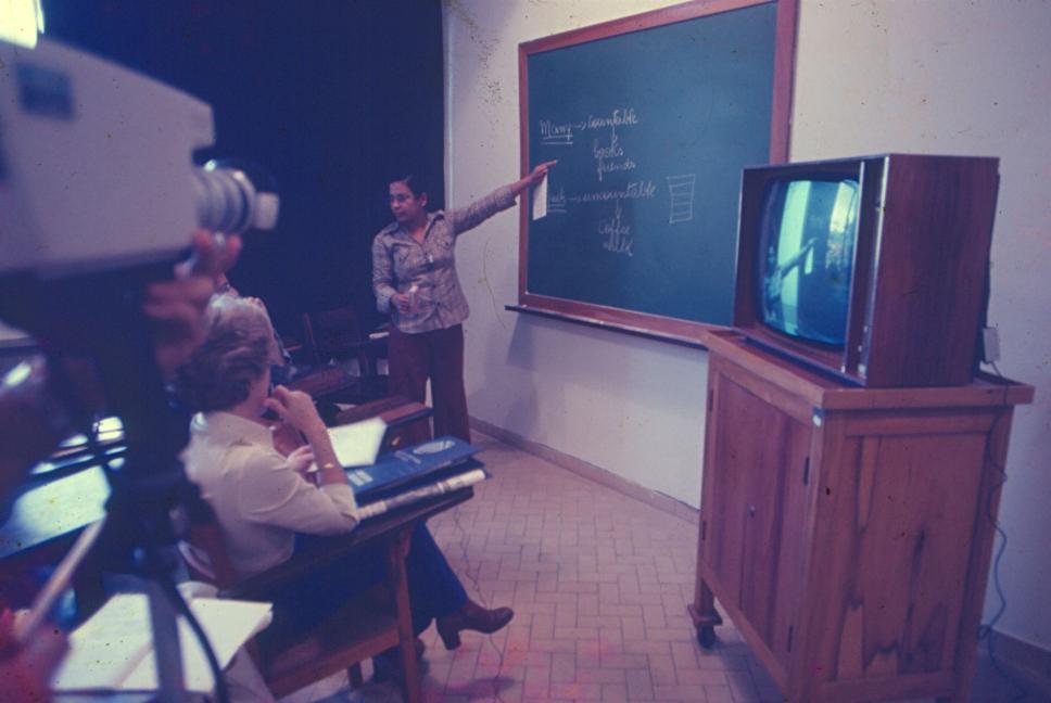 Aula sendo filmada com uma espécie de video-teipe. Conforme o que está escrito no quadro, parece uma aula de língua inglesa.