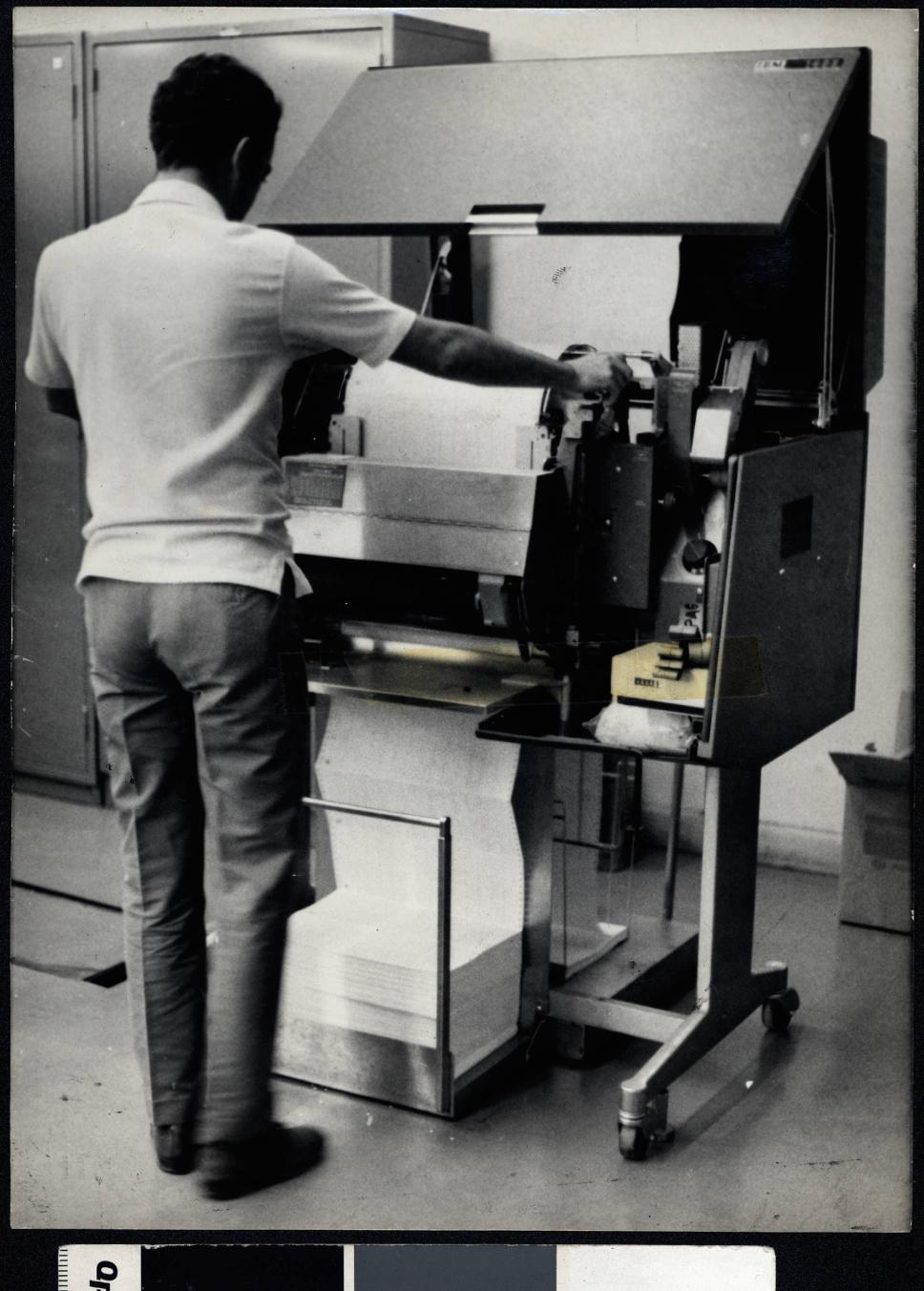 Impressora de formulário contínuo em operação. Este equipamento esteve em funcionamento na PUC-Rio até o final da década de 1980.