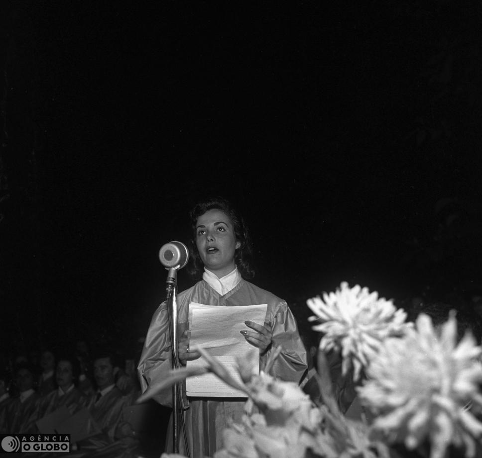 Aluna discursa durante cerimônia de formatura, realizada pela primeira vez no novo campus da Gávea.