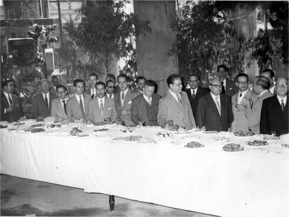 Confraternização com autoridades nos pilotis da Ala Kennedy, com a Ala Frings ainda em construção.