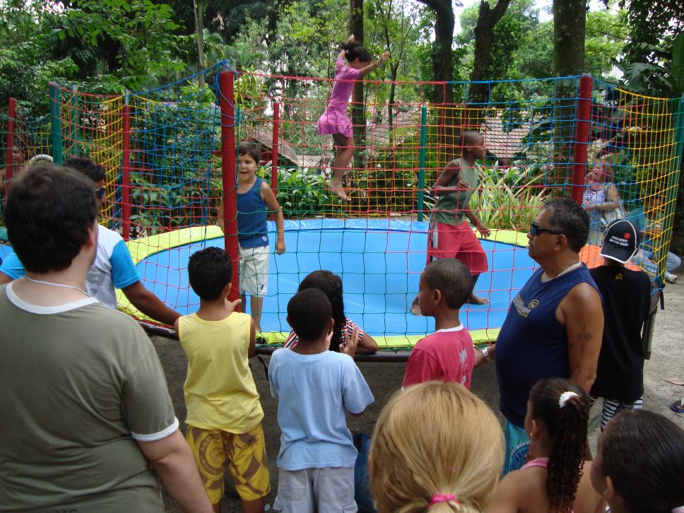 Filhos de funcionários nos brinquedos instalados para a festa de Natal.