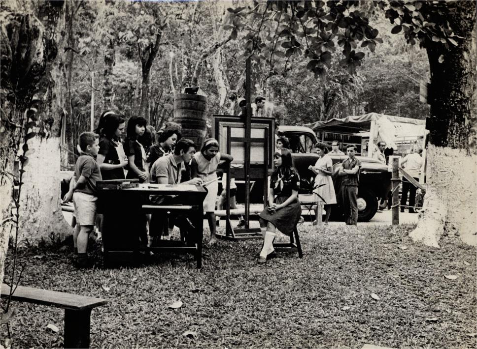 Grupo observa artista que faz retrato de uma menina (bandeirante).