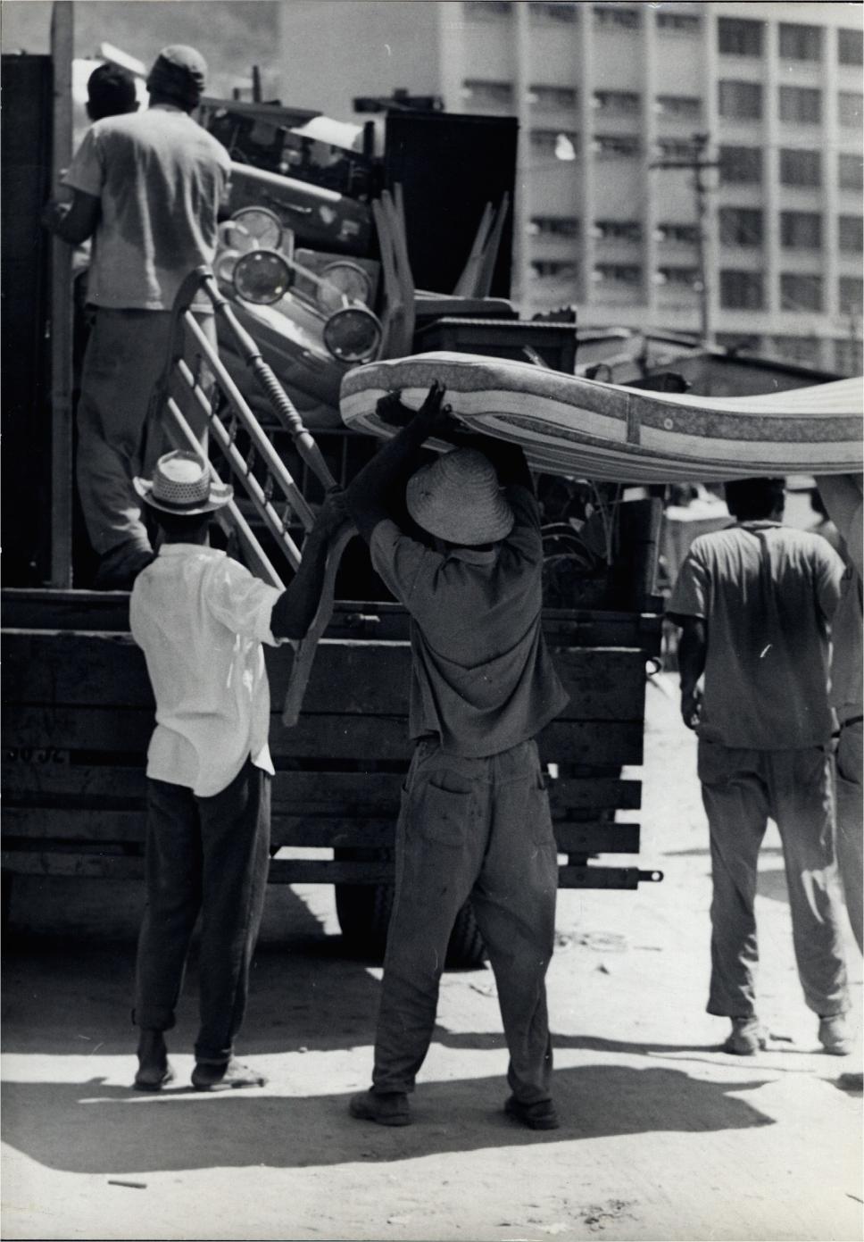 Moradores do Parque Proletário da Gávea colocando seus pertences nos caminhões e ao fundo o Edifício Frings.