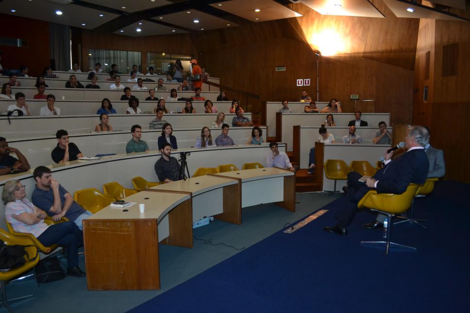 No palco: Otávio Marques de Azevedo (Presidente da Construtora Andrade Gutierrez), Lucas Amorim (Repórter da revista Exame); Último da 1ª fila: Tiago Mitraud (Coordenador de produtos da Fundação Estudar)