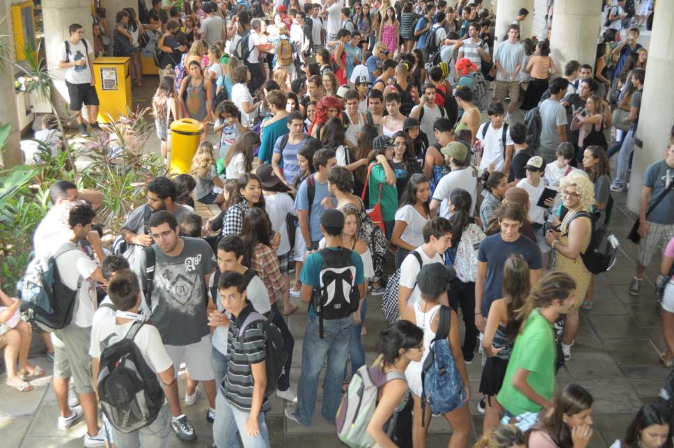 Alunos nos pilotis. Alguns deles estão vestidos para participar do trote de algum curso.
