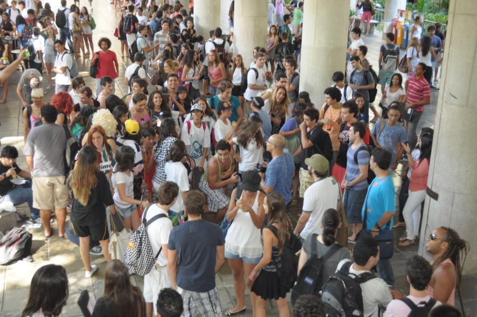 Alunos nos pilotis. Alguns deles estão vestidos para participar do trote de algum curso.