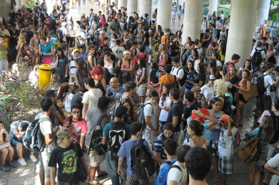 Alunos nos pilotis. Alguns deles estão vestidos para participar do trote de algum curso.
