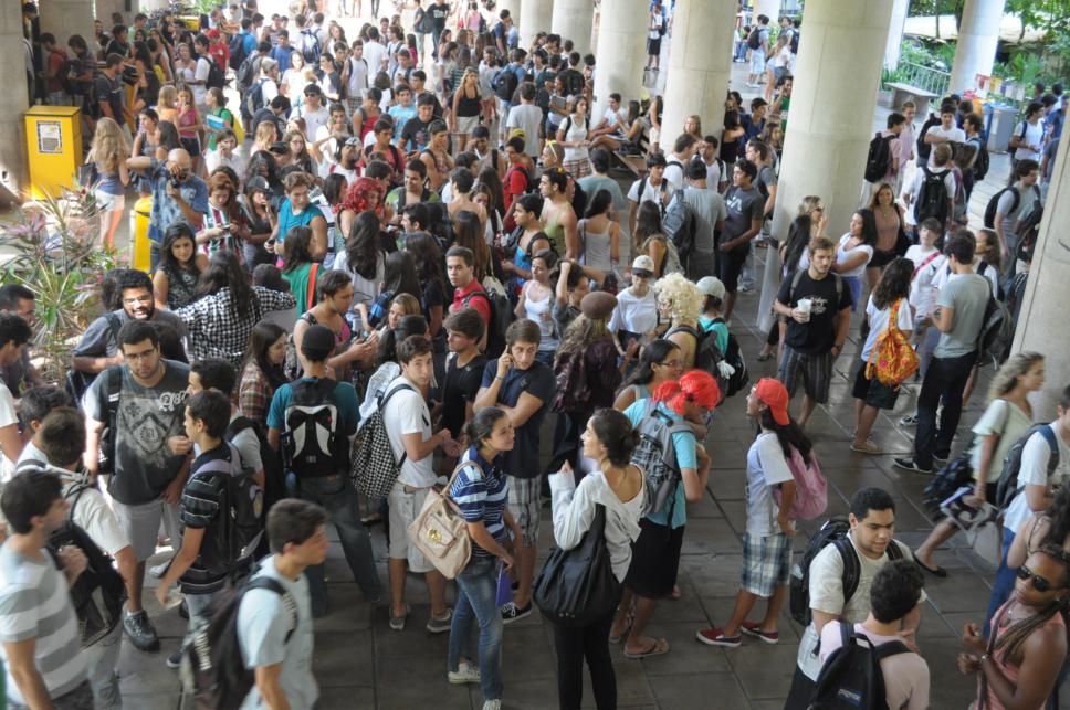 Alunos nos pilotis. Alguns deles estão vestidos para participar do trote de algum curso.