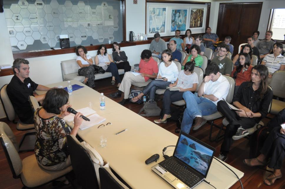 Na mesa da esq. para dir.: profa. Márcia Sá Cavalcante Schuback (Södertörns Högskola, Suécia) e prof. Dax Fonseca Moraes Paes Nascimento (CAC/UERN); 1a. no sofá: prof. Larissa de Aguiar (PPGF/PUC-Rio).