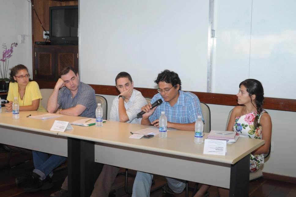 Da esq. para dir.: Larissa de Aguiar (PPGF/PUC-Rio), prof. Roberto Kahlmeyer-Mertens (UCAM), mestrando Julio Brotero de Rizzo (USP), prof. Thiago Aquino (UFPE) e doutoranda Rebeca Furtado de Melo (UERJ).