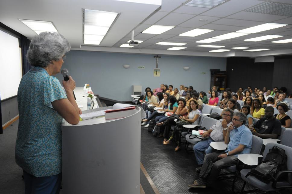 Na primeira fila da dir. para esq.: prof. Marco Aurélio Santana (UFRJ), prof. Ricardo Antunes (UNICAMP); No púlpito: profa. Luiza Helena Nunes Ermel (SER)