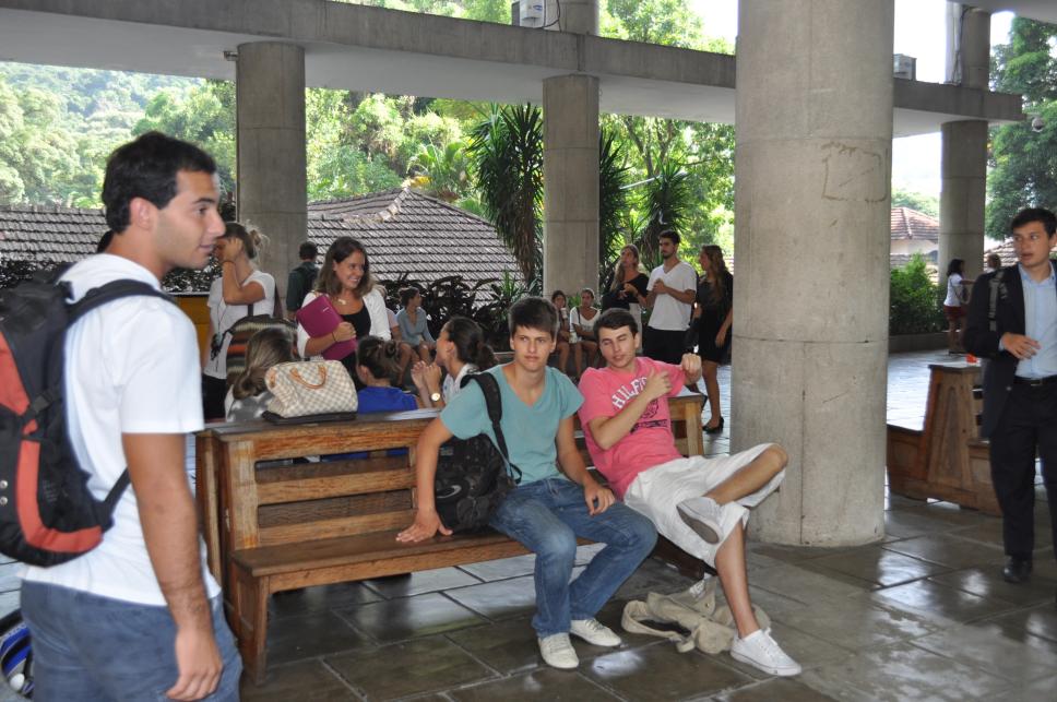 Alunos nos pilotis. Ao fundo, a Vila dos Diretórios.