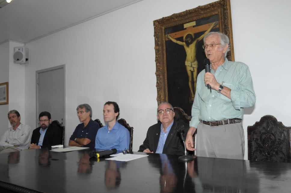 De esq. para dir.: prof. Ricardo Tanscheit (ELE), prof. Luiz Alencar Reis da Silva Mello (CETUC), prof. José Ricardo Bergmann (CETUC, Vice-Reitor para Assuntos Acadêmicos), prof. José Ricardo Bergmann (CETUC, Vice-Reitor para Assuntos Acadêmicos), prof. Luiz Felipe Roris Rodriguez Scavarda do Carmo (IND), prof. pe. Josafá Carlos de Siqueira S.J. (GEO, Reitor), prof. Nélio Domingues Pizzolato (IND)