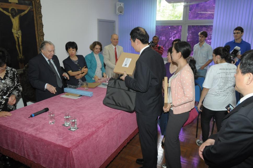 Da esq. para dir.: Li Weihong (Vice-ministra chinesa da Educação), prof. pe. Francisco Ivern Simó S.J. (Vice-Reitor), 4ª Silvia Beatriz Alexandra Becher Costa (LET), 5o prof. Karl Erik Schøllhammer (LET)