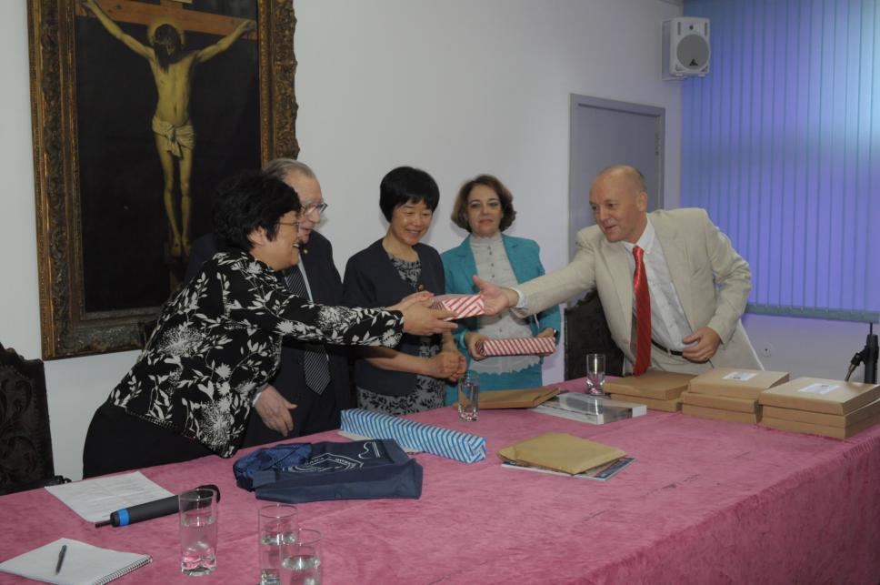 Na mesa da esq. para dir: Li Weihong (vice-ministra chinesa da Educação), prof. pe. Francisco Ivern Simó S.J. (Vice-Reitor), n.i., Silvia Beatriz Alexandra Becher Costa (LET) e prof. Karl Erik Schøllhammer (LET)