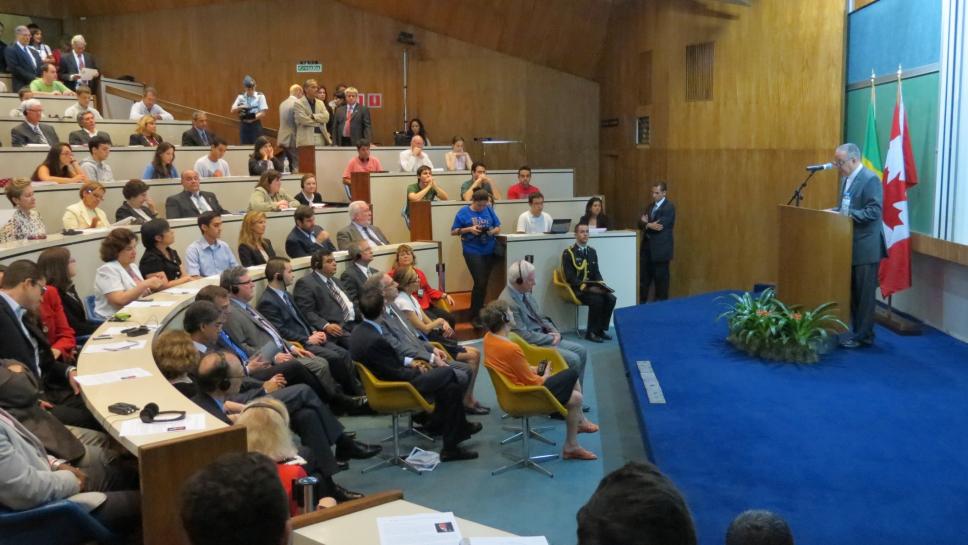 No púlpito: prof. pe. Josafá Carlos de Siqueira S.J. (GEO, Reitor); na primeira fila de cadeias da esq. para dir.: Sharon Johnston e David Johnston (governador-geral do Canadá); 2º na segunda fila de cadeiras da esq. para dir: prof. Danilo Marcondes de Souza Filho (FIL)