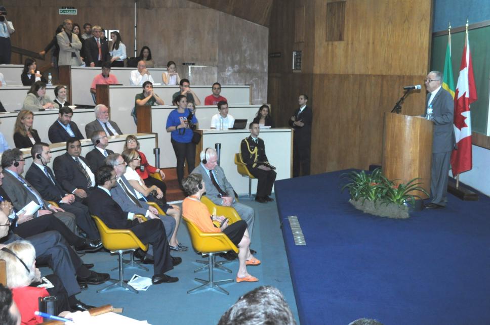 No púlpito: prof. pe. Josafá Carlos de Siqueira S.J. (GEO, Reitor); na primeira fila de cadeias da esq. para dir.: Sharon Johnston e David Johnston (Governador-Geral do Canadá); 2º na segunda fila de cadeiras da esq. para dir: prof. Danilo Marcondes de Souza Filho (FIL)