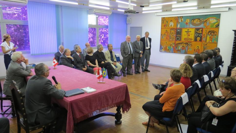 Na mesa da esq. para dir.: David Johnston (governador-geral do Canadá), prof. pe. Josafá Carlos de Siqueira S.J. (GEO, Reitor); na fila de cadeiras próxima à janela, da dir. para esq.: prof. Arndt von Staa (INF), prof. Antônio Luz Furtado (INF), prof. Carlos Lucena (Carlos José Pereira de Lucena) (INF), prof. José Eugênio Leal (IND), prof. Paulo César Duque Estrada (FIL), profa. Rosa Marina de Brito Meyer (LET), prof. José Ricardo Bergmann (CETUC, Vice-Reitor para Assuntos Acadêmicos), pe. Francisco Ivern Simó S.J. (Vice-Reitor)