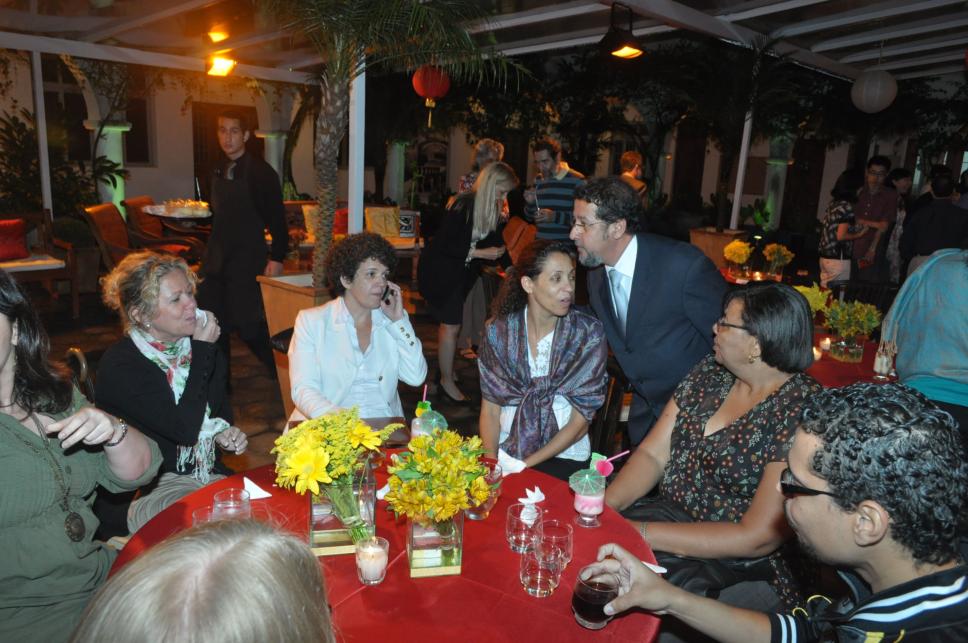 Em pé, na direita da mesa: prof. Júlio Cesar Valladão Diniz (LET) e, ao lado, a secretária Digerlaine Gomes Tenório (LET). Ao fundo, a profa. Luiza Helena Nunes Ermel (SER) e o prof. Fred Palmeira (Carlos Frederico Borges Palmeira) (MAT)