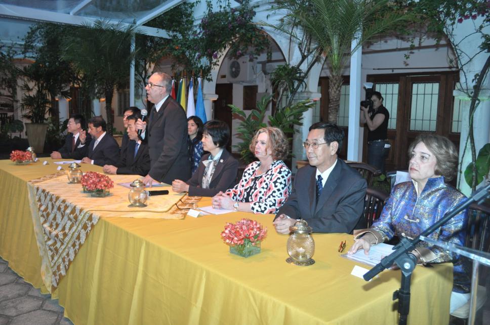 Na mesa da esq. para a dir.: Guo Fuliang (diretor do Instituto Confucius), prof. Júlio Cesar Valladão Diniz (LET), Zheng Kejun (conselheiro Cultural da Embaixada da China no Brasil), Yan Chunlai (vice-diretor da Secretaria de Educação de Hebei), prof. pe. Josafá Carlos de Siqueira S.J. (GEO, Reitor), Chen Xiaoling (cônsul-geral da China no Brasil), profa. Rosa Marina de Brito Meyer (LET), Wang Junxiang (vice-reitor da Universidade de Hebei), Silvia Beatriz Alexandra Becher Costa (LET)