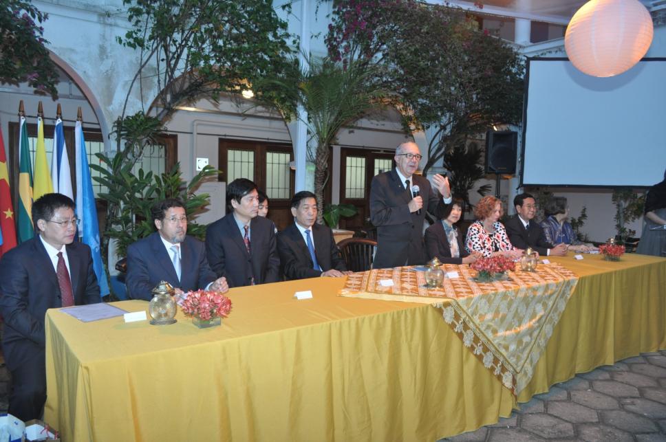 Na mesa da esq. para a dir.: Guo Fuliang (diretor do Instituto Confucius), prof. Júlio Cesar Valladão Diniz (LET), Zheng Kejun (conselheiro Cultural da Embaixada da China no Brasil), Yan Chunlai (vice-diretor da Secretaria de Educação de Hebei), prof. pe. Josafá Carlos de Siqueira S.J. (GEO, Reitor), Chen Xiaoling (cônsul-geral da China no Brasil), profa. Rosa Marina de Brito Meyer (LET), Wang Junxiang (vice-reitor da Universidade de Hebei), Silvia Beatriz Alexandra Becher Costa (LET)