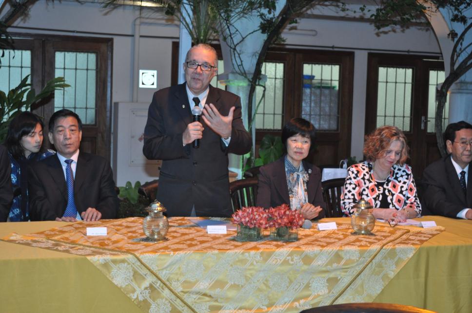 Da esq. para a dir.: n.i. Yan Chunlai (vice-diretor da Secretaria de Educação de Hebei), prof. pe. Josafá Carlos de Siqueira S.J. (GEO, Reitor), Chen Xiaoling (cônsul-geral da China no Brasil), profa. Rosa Marina de Brito Meyer (LET), Wang Junxiang (vice-reitor da Universidade de Hebei)