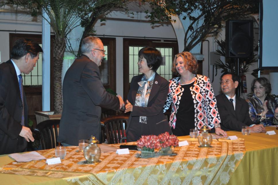 Da esq. para a dir.: Yan Chunlai (vice-diretor da Secretaria de Educação de Hebei), prof. pe. Josafá Carlos de Siqueira S.J. (GEO, Reitor), Chen Xiaoling (cônsul-geral da China no Brasil), profa. Rosa Marina de Brito Meyer (LET), Wang Junxiang (vice-reitor da Universidade de Hebei), Silvia Beatriz Alexandra Becher Costa (LET)