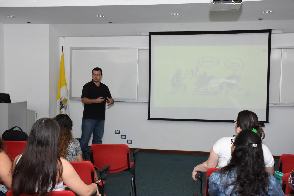 Alunos observam a palestra.