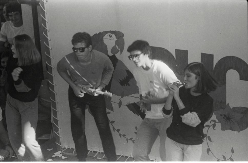 Alunos em performance musical no palco da I Feira de Moda da PUC-Rio.