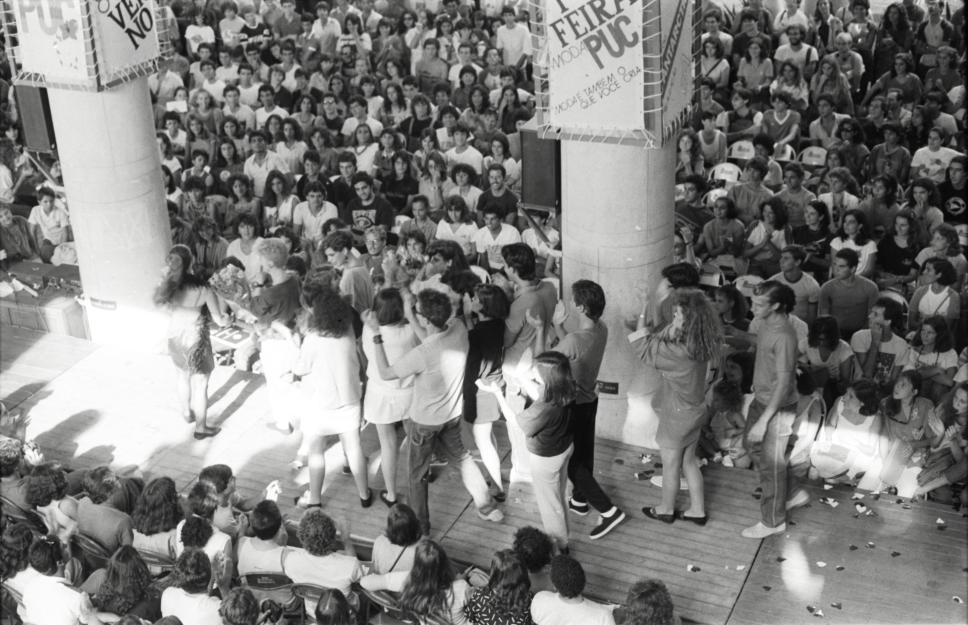 Grupos de alunos no palco aplaudem o desfile de moda.