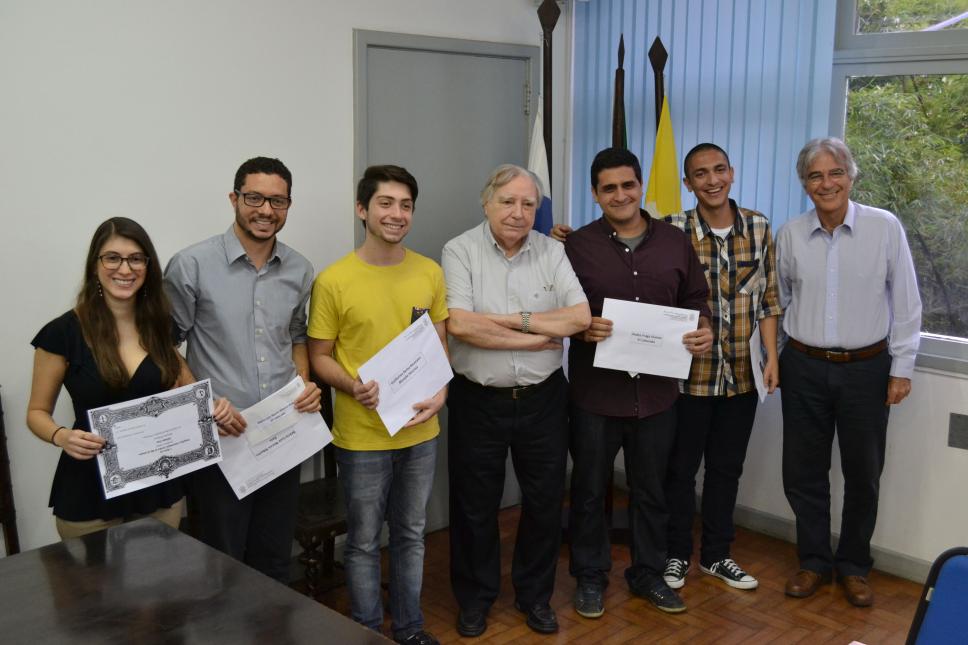Da esq. a dir.: 1º a aluna Adriana Fux (DAD), 2º o aluno Mário Luiz Norris Ribeiro Reis (JUR), 3º Guilherme Borba Neumann (BIO), 4º prof. pe. Francisco Ivern Simó S.J (Vice-Reitor), 5º aluno Pedro Fraga Vianna (HIS), 6º aluno Matheus Lima Targuêta (HIS), 7º prof. José Ricardo Bergmann (CETUC, Vice-Reitor para Assuntos Acadêmicos).