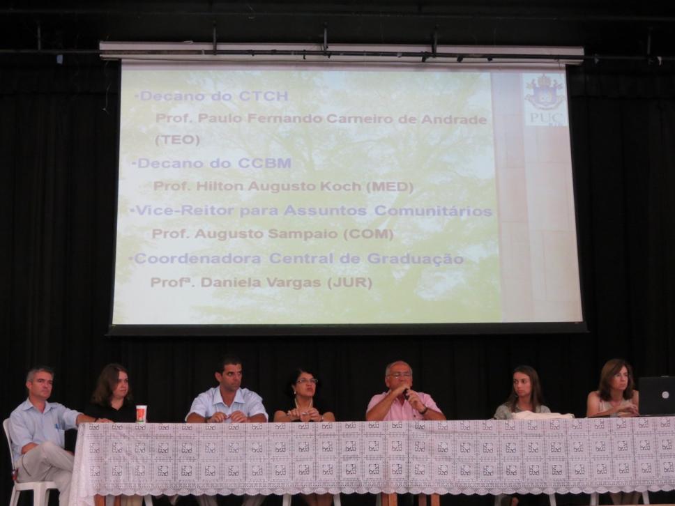 Na mesa da esq. para dir.: Prof. André Lacombe Penna da Rocha (ADM, CCESP), Juliana Bacellar Brandão Guimarães (FESP), prof. Renato Callado Ferreira (CEF), n.i., prof. Augusto Sampaio (Vice-Reitor para Assuntos Acadêmicos), Suzana de Mattos Kerber (CACC), profa. Daniela Trejos Vargas (JUR)