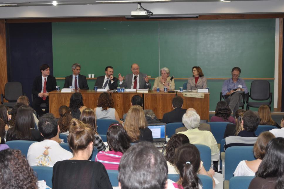 Na mesa da esq. para dir.: prof. Francisco de Guimaraens (JUR), prof. Alessandro Lucciola Molon (JUR) (Alessandro Molon), prof. Adriano Pilatti (JUR), Paulo Vannuchi (Ministro da Secretaria dos Direitos Humanos da Presidência da República), Margarida Pressburger (advogada do Subcomitê de Prevenção da Tortura da ONU), profa. Daniela Trejos Vargas (JUR) e o prof. João Ricardo Wanderley Dornelles (JUR)