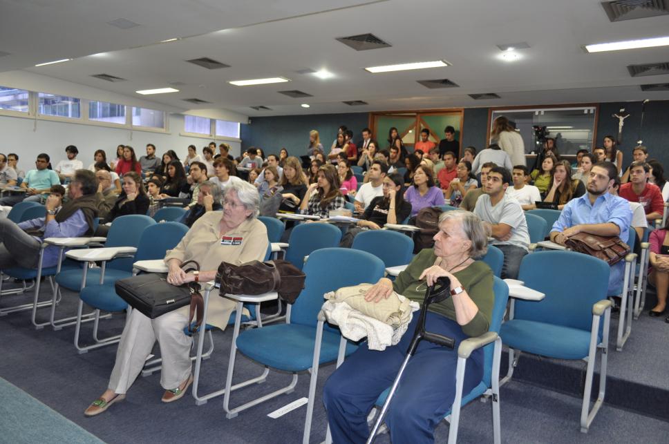 Palestrantes, professores e alunos na plateia da Aula Magna.