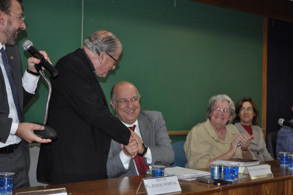 Da esq. para dir.: prof. Adriano Pilatti (JUR), prof. pe. Jesús Hortal Sànchez S.J. (TEO, Reitor), Paulo Vannuchi (Ministro da Secretaria dos Direitos Humanos da Presidência da República), n.i., profa. Daniela Trejos Vargas (JUR)