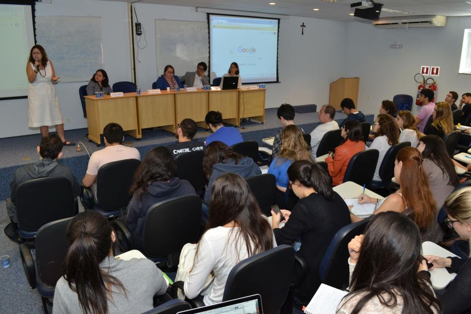 Na mesa da esq. para dir.: em pé ao microfone, Heloisa Lessa (Enfermeira obstetra e doutora em Enfermagem EEAN/ UFRJ); profa. Adriana Vidal de Oliveira (JUR); profa. Thamis Ávila Dalsenter (JUR); Ricardo Chaves (Médico pediatra e Mestre em Saúde Pública IMS/ UERJ); Laura Uplinger (Psicóloga licenciada em psicologia experimental pela Sorbonne, Paris)