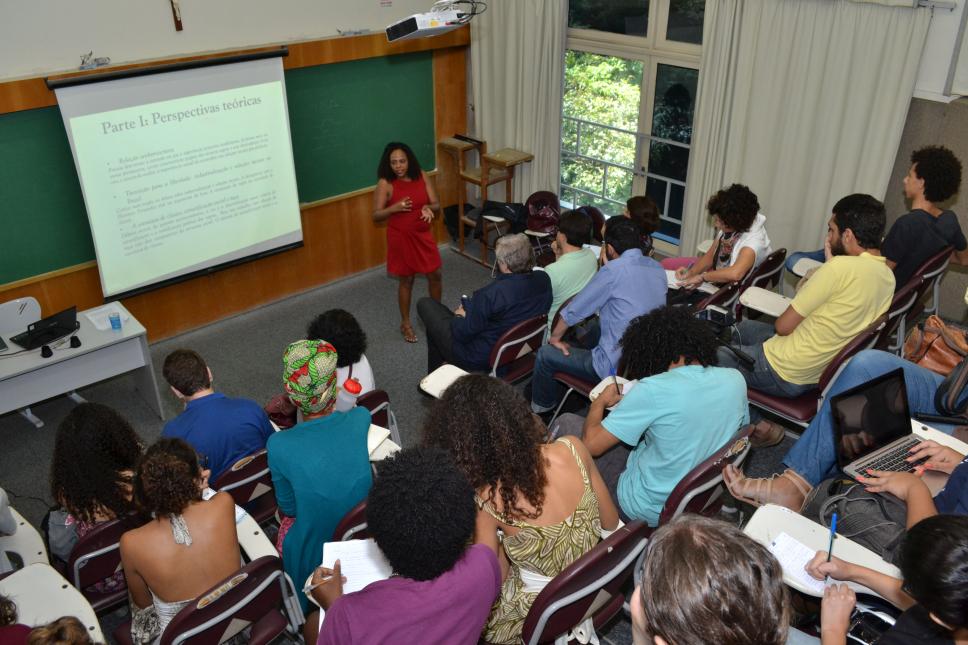 profa. Marcia Lima (USP), em pé de vestido vermelho