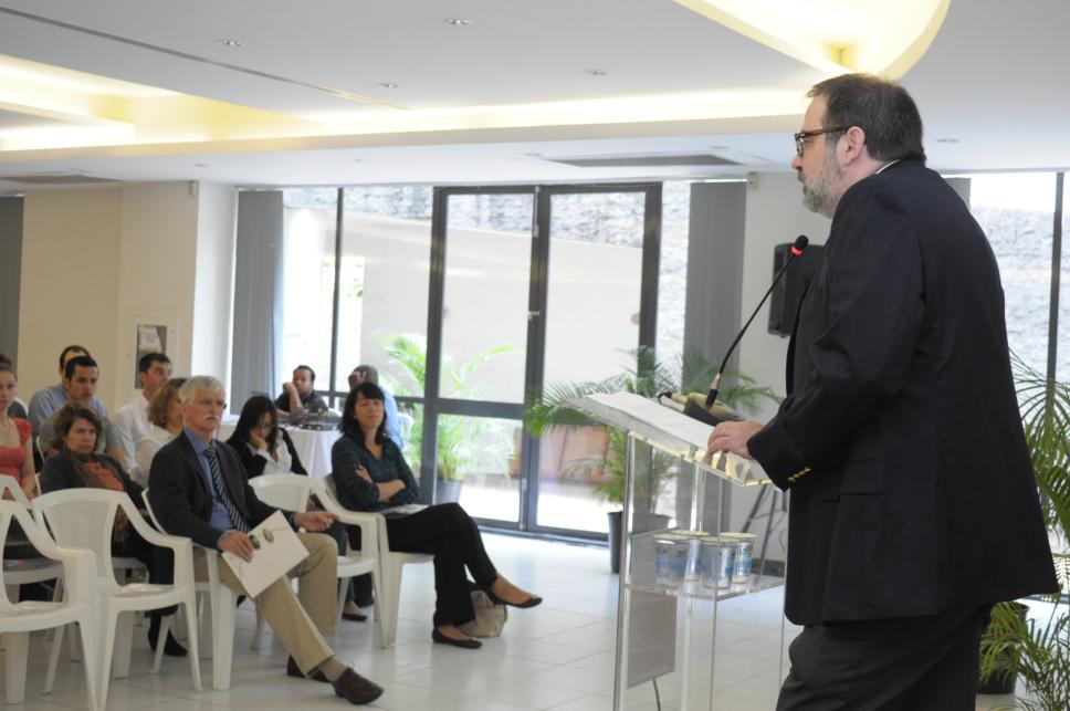 O prof. Sérgio Veloso dos Santos Junior (IRI), em pé ao microfone; na 1ª fila de cadeiras da esq. para dir.: prof. Mervyn Frost (Kings College de Londres) e a profa. Carolina Moulin Aguiar (IRI)