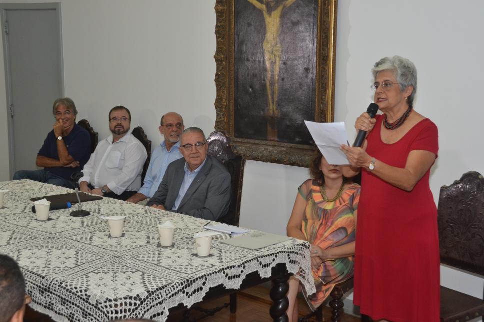 A professora Luiza Helena Ermel fala na cerimônia de posse.
