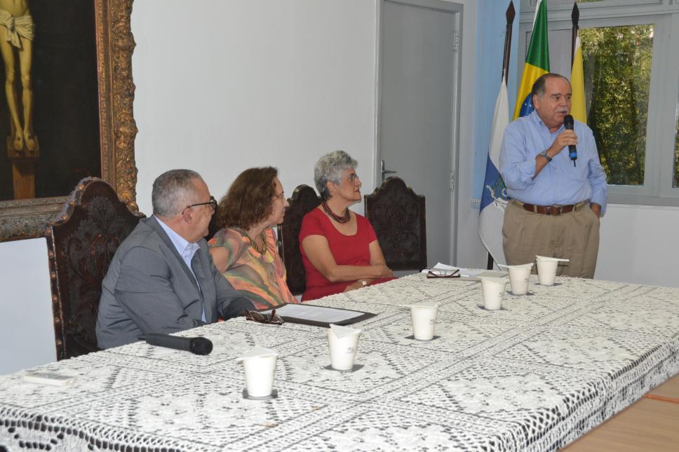 Da esq. para dir.: 1º prof. pe. Josafá Carlos de Siqueira S.J. (BIO, Reitor), 2ª profa. Andreia Clapp Salvador (SER), 3ª profa. Andreia Clapp Salvador (SER), 4º prof. Luiz Roberto Azevedo Cunha (ECO, Decano CCS)