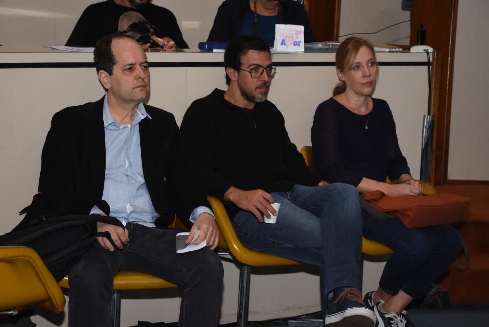 Da esq. para dir.: arquiteto Ângelo Bucci (FAUUSP), prof. Pedro Évora (DAU), Barbara Silva (Arquiteta, curadora e editora independente)