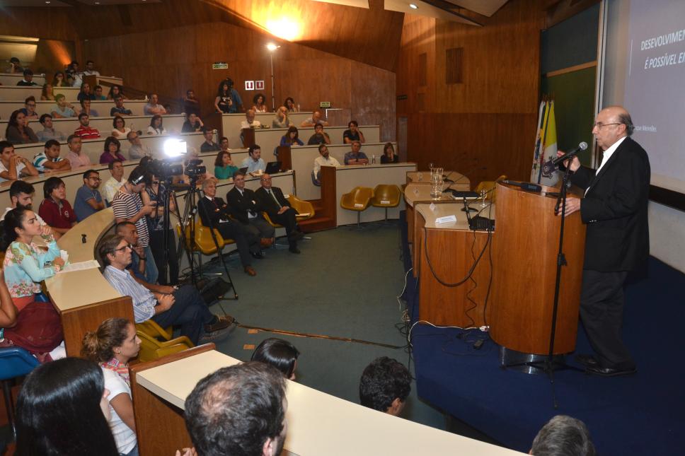 Plateia assiste Aula Magna com Henrique Meirelles.