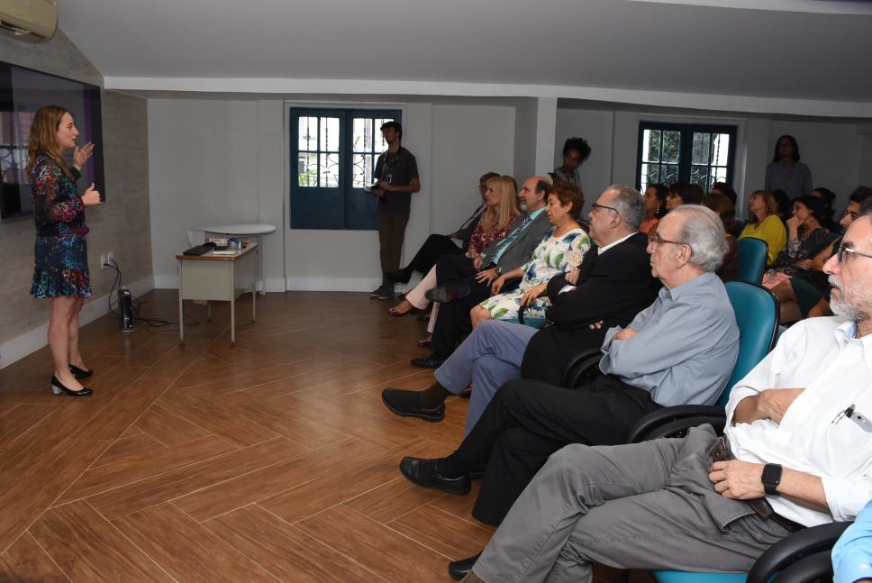 Professora Helenice fala a plateia na inauguração das novas instalações do SPA.