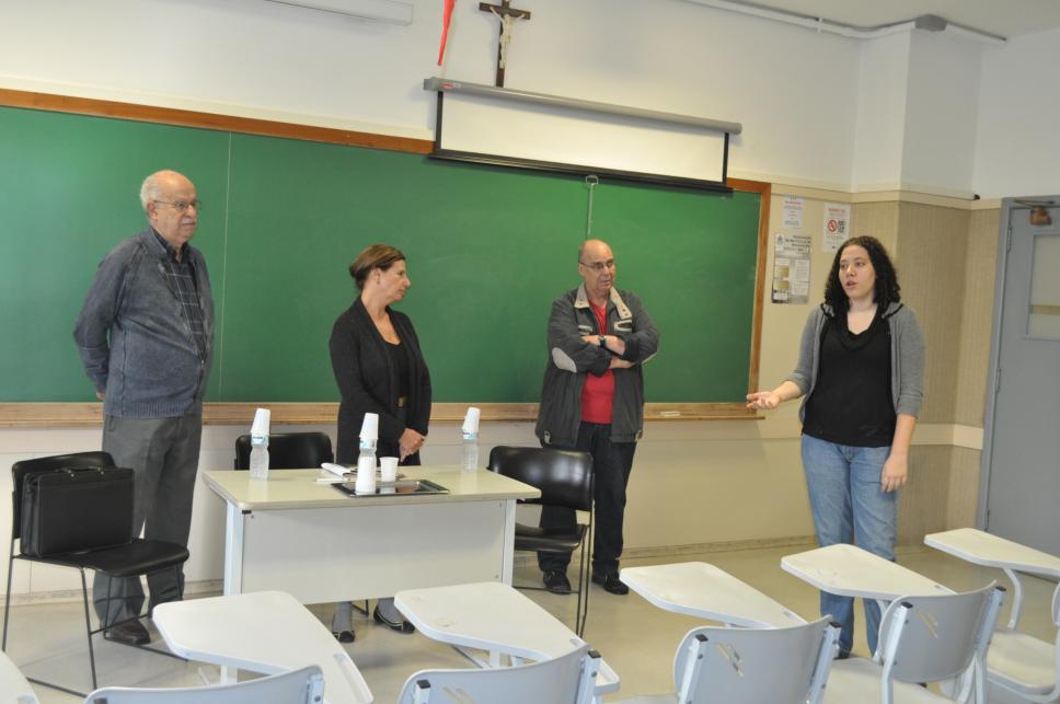 Encontro de historiadores realizado pelo Departamento de história com os dois professores convidados em pé, junto com a professora mediadora e uma aluna da graduação em história.