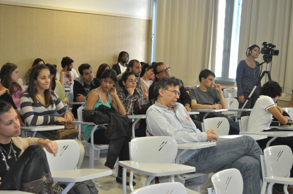 Pessoas assistindo o encontro com historiadores realizado pelo Departamento de História, entre elas alunos e professores.
