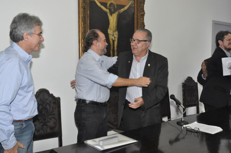 Prof. Marco Antonio Villela Pamplona abraça o reitor em sua cerimônia de posse como diretor do Departamento de História.