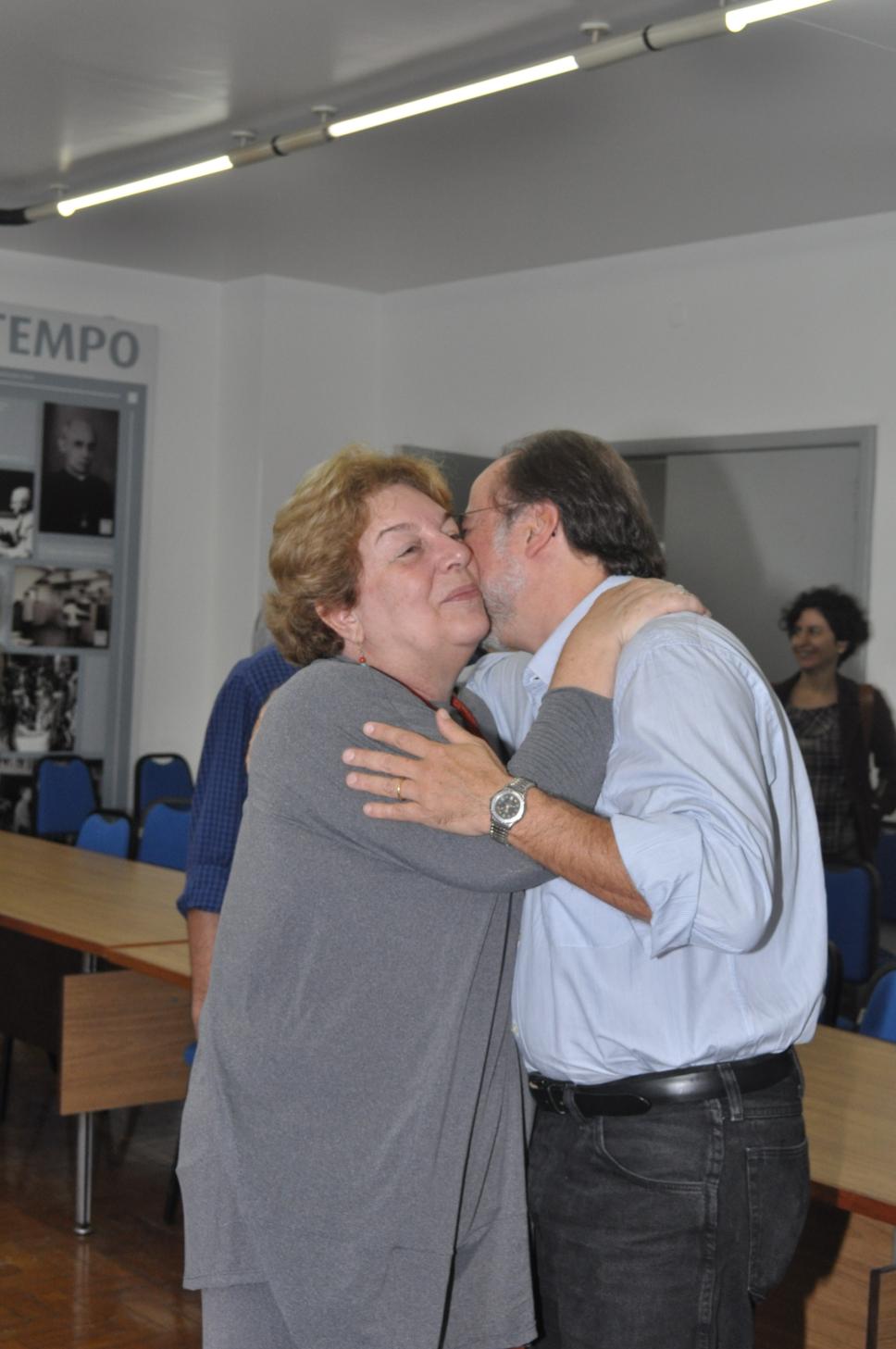 A profa. Margarida de Souza Neves cumprimenta o novo diretor do Departamento de História, prof. Marco Antonio Pamplona.