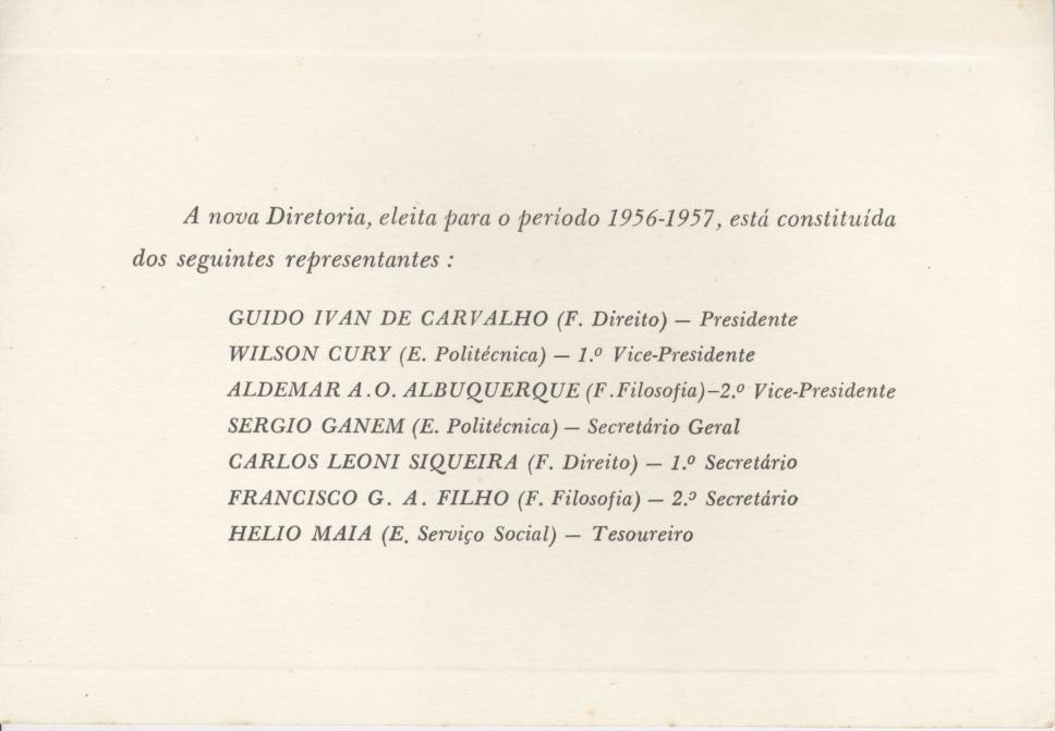 Convite do Diretório Central de Estudantes para a cerimônia de posse da nova Diretoria da Entidade, com a lista dos novos representantes.