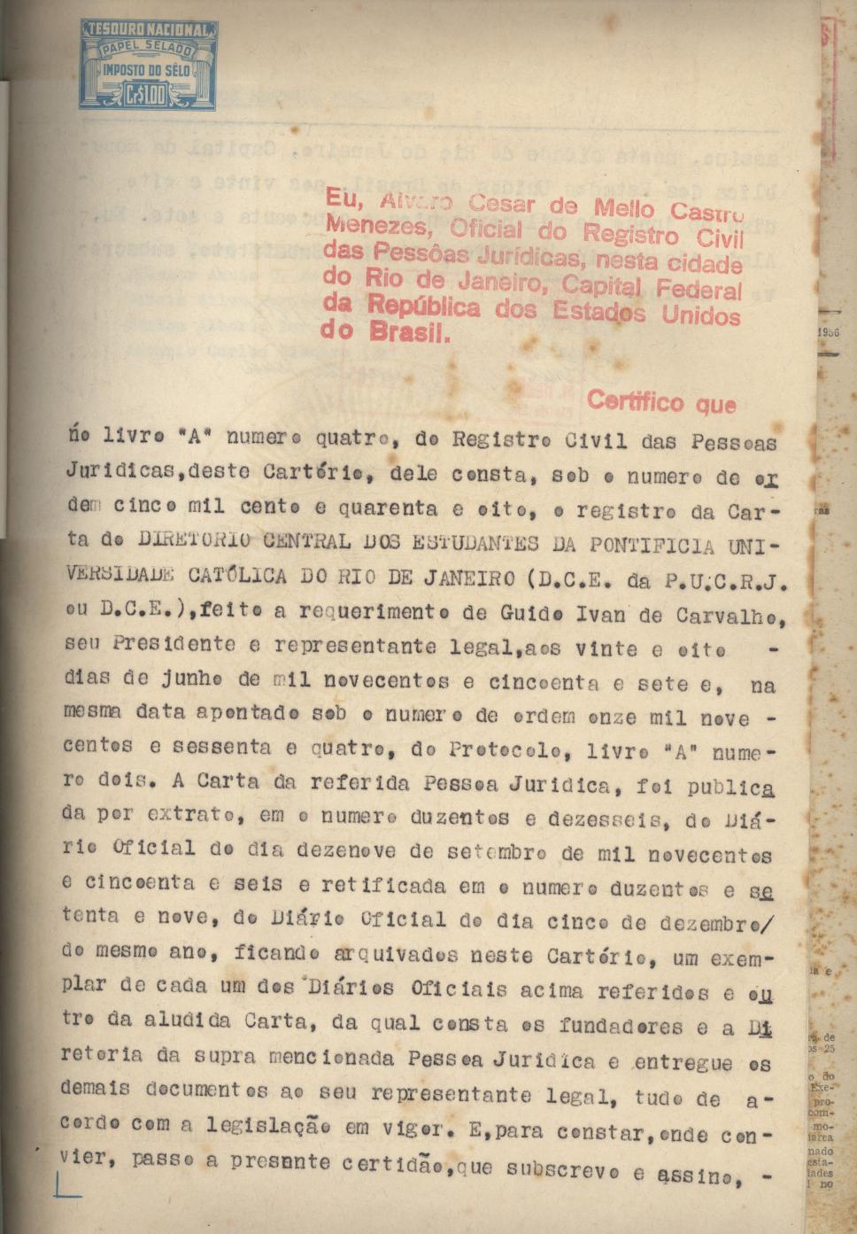 Certificação do registro civil de pessoa jurídica do Diretório Central dos estudantes.